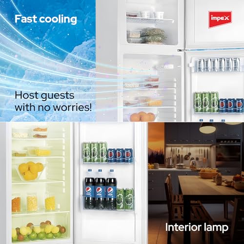 Spacious Capacity refrigerator : With a generous 355 litres Gross capacity this refrigerator offers ample storage space for all your groceries. It features an 88-litre freezer and a 267-litre refrigerator section. Efficient Cooling refrigerator : Experience fast and efficient cooling with a direct cool system and a high-efficiency compressor. Impex Double Door refrigerator: Rapid cooling and quick chilling of drinks. Keeps fruits, vegetables, meat, fish, juices, and milk products fresh for an extended period Convenient Design: Includes adjustable legs, a one-line handle, and glass shelves for easy organization and access. Enhanced Functionality: This refrigerator Equipped with an egg tray and an interior lamp to keep everything visible and accessible. Quiet operation: Enjoy a peaceful kitchen environment with low noise operation, coupled with Energy Saving technology for an eco-friendly solution The Impex Double Door refrigerator 2-year warranty on the product and a 5-year warranty on the compressor