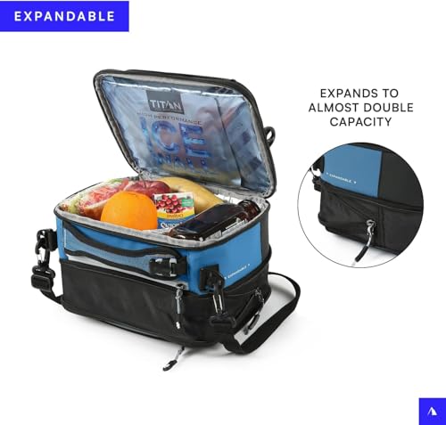 FRIDGE COLD PERFORMANCE: Titan lunch bag keeps items Fridge Cold (under 40°F/4.4°C) for up to 6 hours and chilled (under 50°F/10°C) for up to 12 hours*; Includes 2 High Performance Ice Walls (reusable ice packs) and SuperFoam insulation with Therma-Flect radiant barrier interior EXPANDABLE & DURABLE: The rugged exterior is stain and water repellent and features a crush-resistant, EVA molded front and back panels; The lunch bag expands to almost double capacity for long days or when you want to pack more EASY CLEAN INTERIOR: Ultra Safe leak proof** lining makes the product easier to clean. **Zipper is not leak proof ACCESSORIES: Includes 2 reusable, food safe, high performance Ice Walls (ice packs made of made of non-toxic gel) that provide long-lasting cold; Also includes a leak proof food container set for easy meal prep EASY TO CARRY: This lunch bag includes 5 different ways to carry, with 2 padded handles, and a removable, adjustable shoulder strap; This lunch bag is great for a work lunch box, lunch box for the job site, daily commutes & beyond