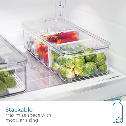 iDesign Crisp Stackable Refrigerator and Pantry Large Divided Bin, BPA Free Plastic, Clear and White