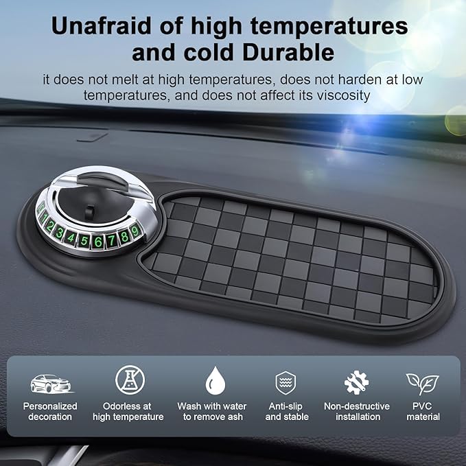 😃【Multifunction Car Anti-Slip Mat Auto Phone Holder】This universal mobile phone holder for cars will not fall off even if it shakes, and can prevent your phone from being scratched, bumped or flying out during emergency braking, emergency parking or sharp turns. Multifunctional design, It integrates a mobile phone holder, a storage mat, and a temporary parking sign. It is practical and convenient. 😃【Car Anti Slip Mat Phone Holder】The car anti-slip pad phone stand is equipped with a 360-degree rotatable phone stand. The phone stand is stable and does not shake. It can rotate and adjust the Angle of the phone as needed, making navigation more convenient. 😃【Multi-Function Design】The base of the mobile phone stand is equipped with 6 sets of temporary parking number stickers. Just rotate it to choose to hide or show, protecting your privacy. The numbers outside the car window are clearly visible. When parking temporarily, your mobile phone number will be of great help to you. 😃【 Easy to Use 】 The multi-functional car anti-slip pad phone holder is made of high-quality silicone material, firmly adhering to the dashboard and preventing items from slipping. It is very simple to use and does not require complex installation procedures. Just place it on the dashboard and it can be used. 😃【Dashboard Storage Pad】This universal mobile phone stand is equipped with an oversized pad that can store most of your items, such as keys, glasses, pens, coins, and other small tools or decorations. The anti-slip pad for the car dashboard can keep your interior well-organized and bid farewell to clutter.