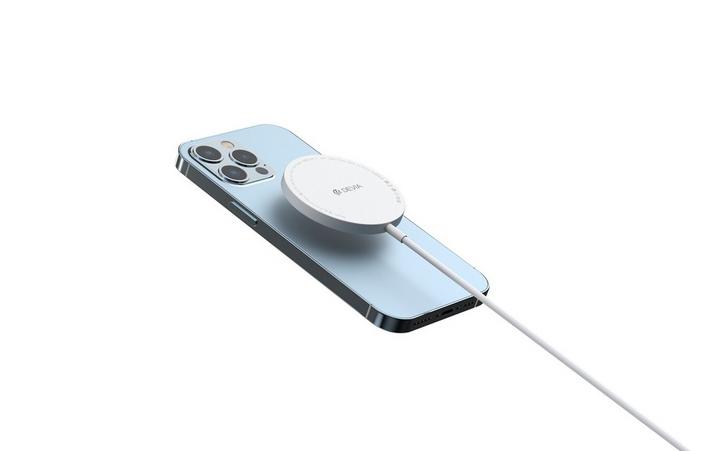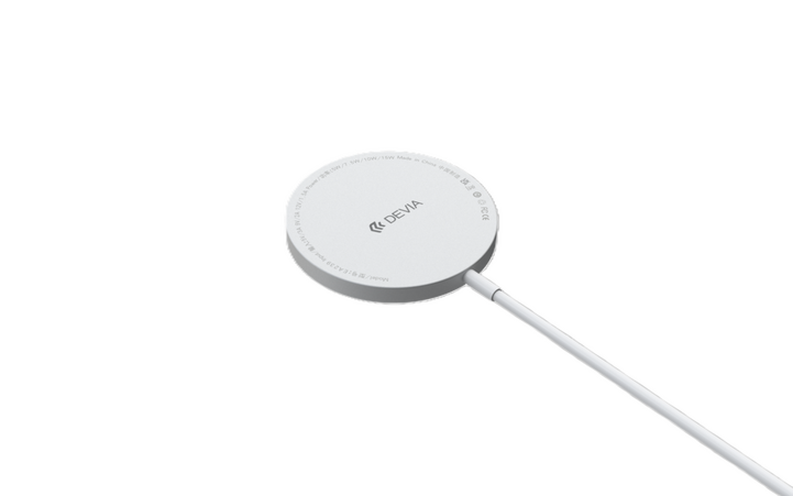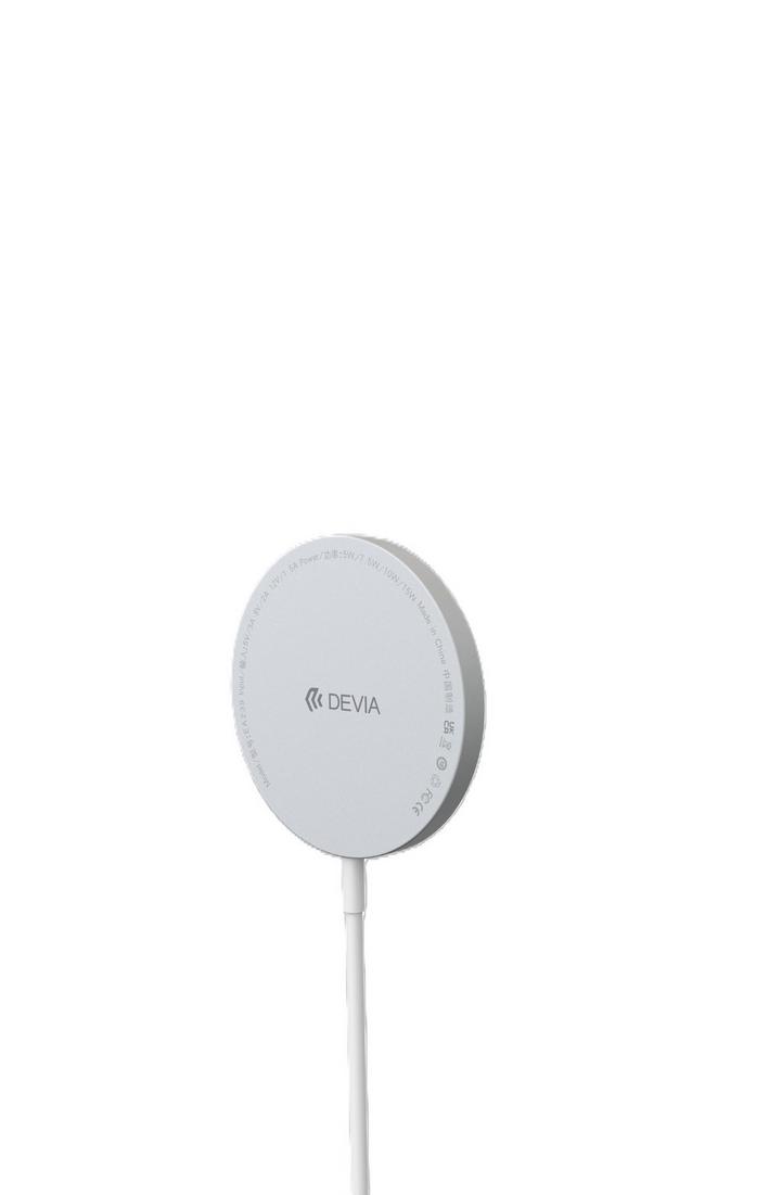 شاحن Devia EA239 اللاسلكي المغناطيسي لأجهزة iPhone وغيرها من الأجهزة، يدعم الشحن بتقنية Qi – باللون الأبيض