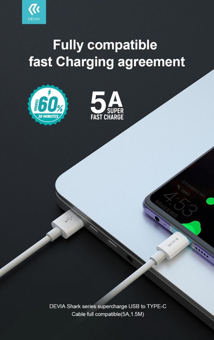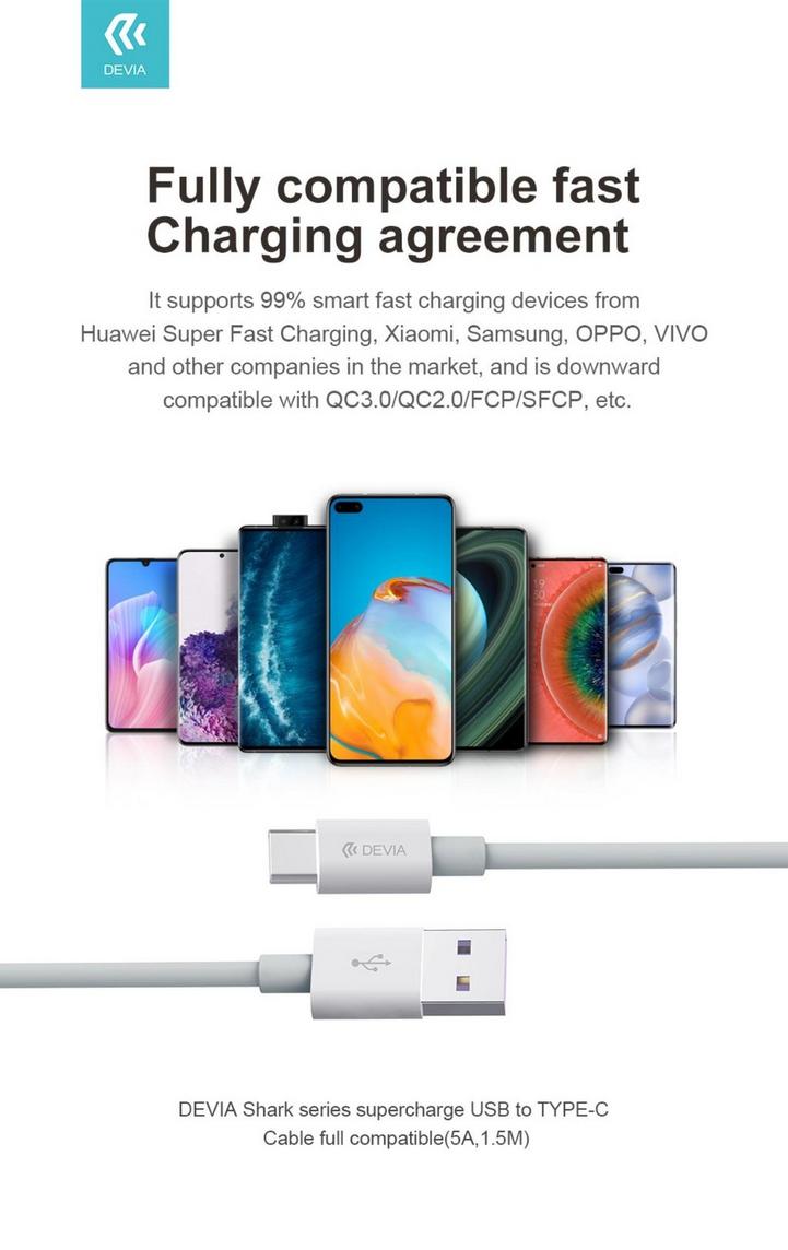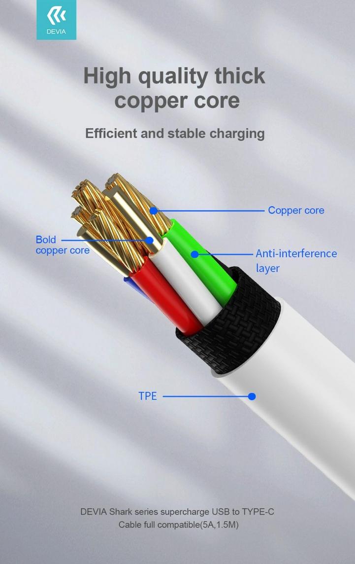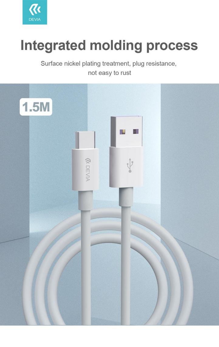 ديفيا كابل شحن من يو اس بي الي تايب سي - 5 امبير ونقل بيانات، شهادة: CE/ROHS مصنوع من مادة عالية الجودة ومتينة TBE، الطول: 1.5 متر، اللون:ابيض
