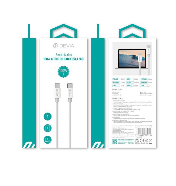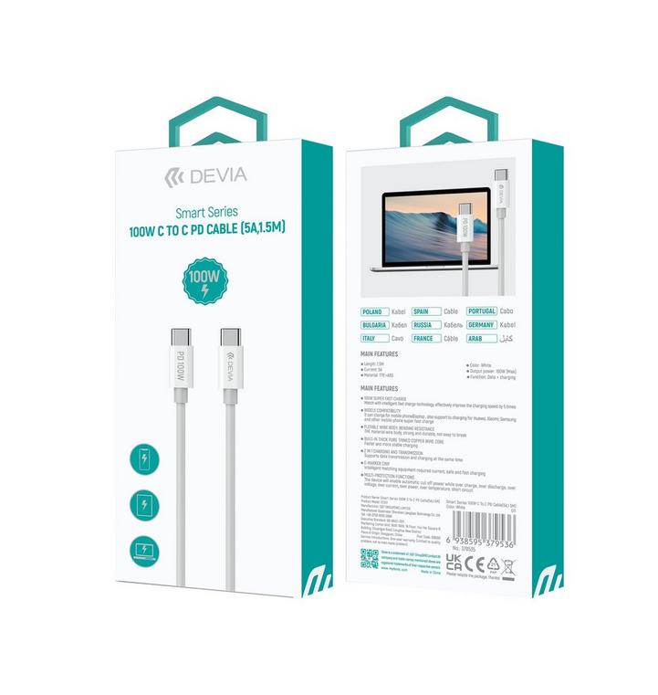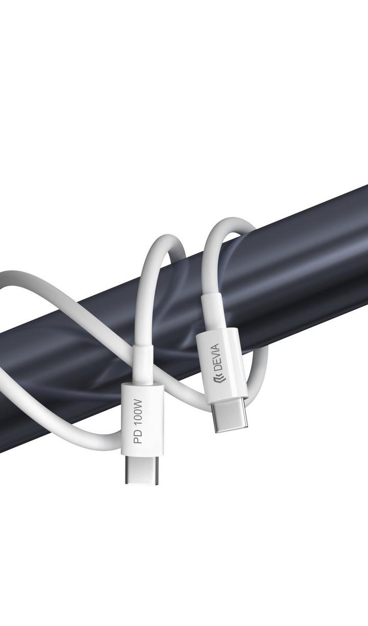 ديفيا كابل شحن من تايب سي الي تايب سي 100 وات / 5 امبير ونقل بيانات، شهادة: CE/ROHS مصنوع من مادة عالية الجودة ومتينة TBE+ABS، الطول: 1.5 متر، اللون: أبيض