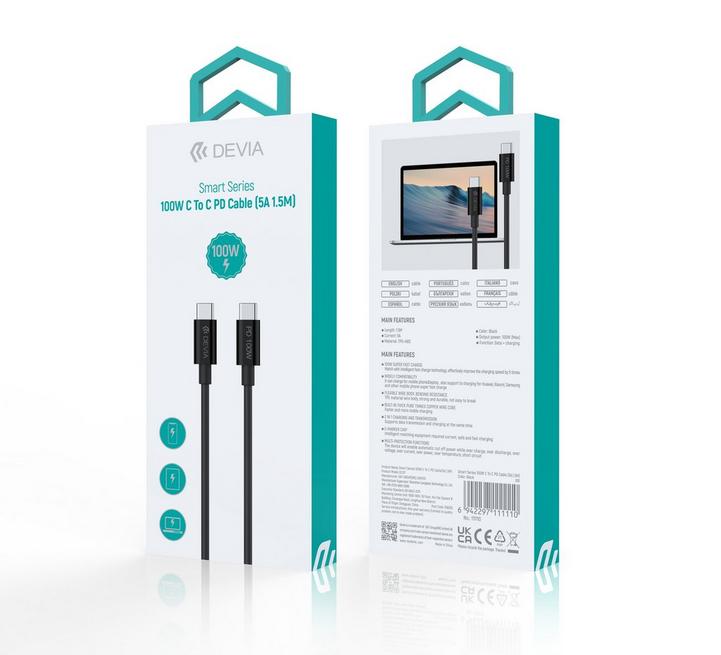 ديفيا كابل شحن من تايب سي الي تايب سي 100 وات / 5 امبير ونقل بيانات، شهادة: CE/ROHS مصنوع من مادة عالية الجودة ومتينة TBE+ABS، الطول: 1.5 متر، اللون:اسود