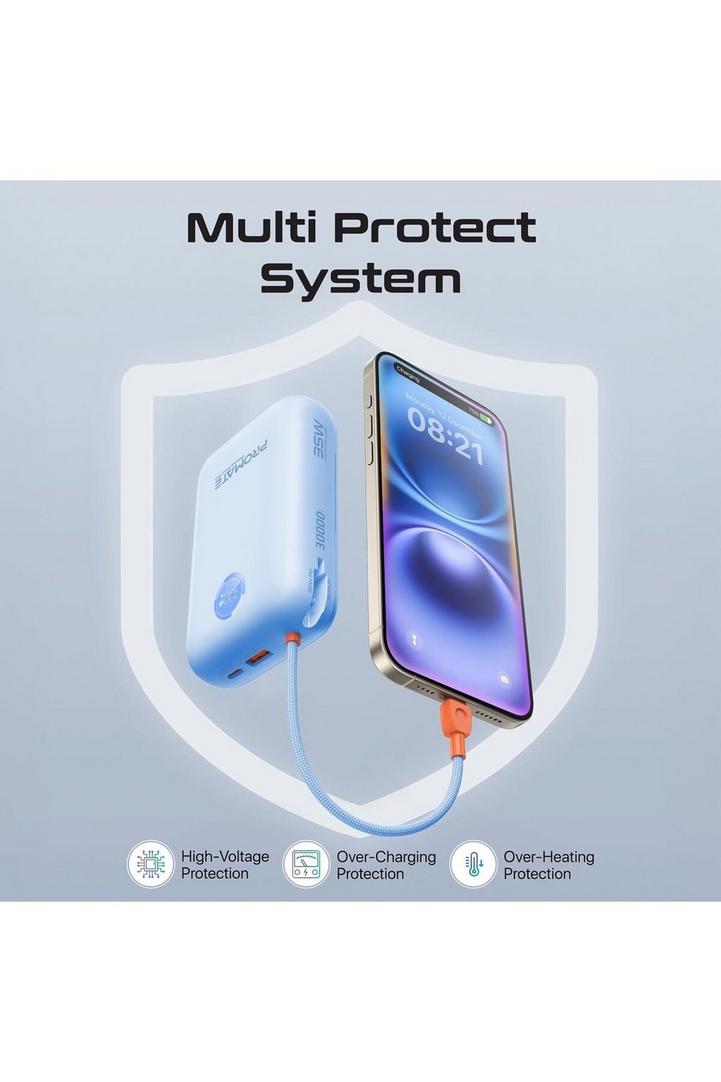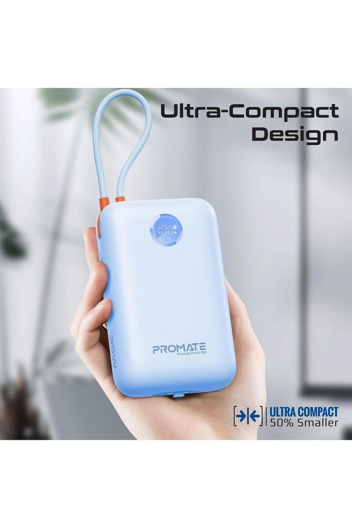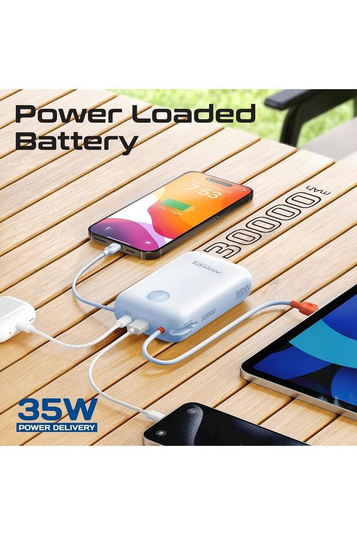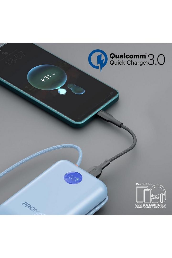 Promate بنك طاقة 4في1 30K، 35W، كابل USB-C وLightning، QC3.0، أزرق
