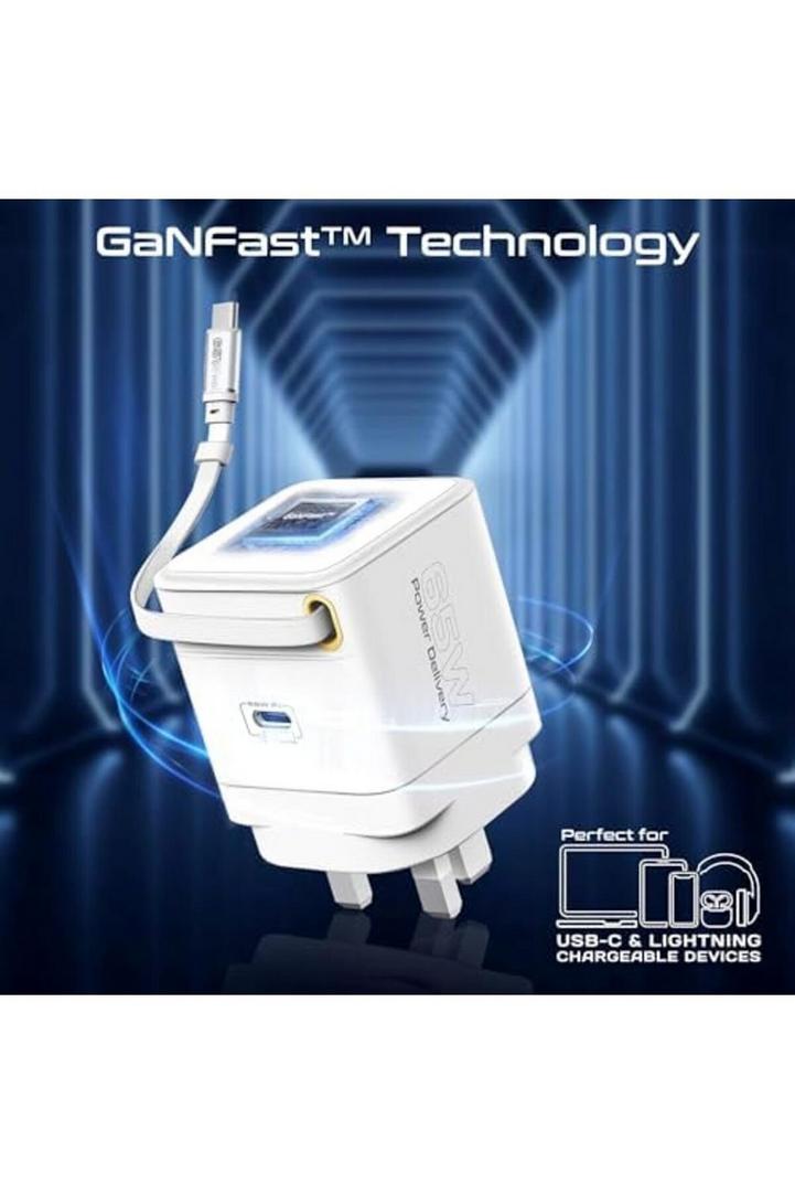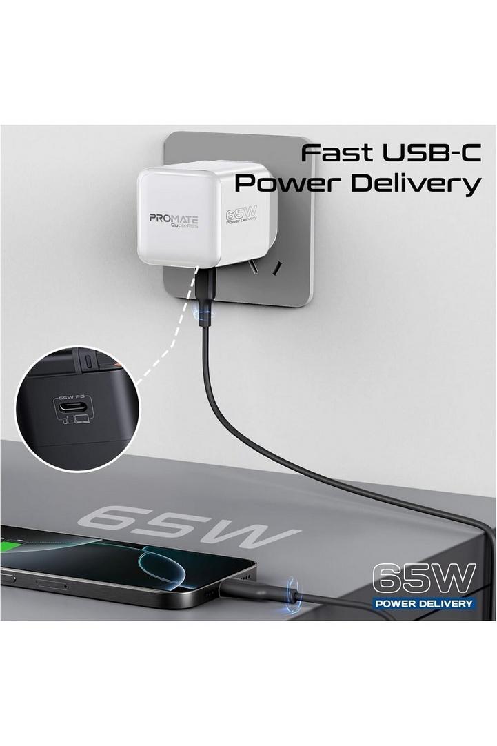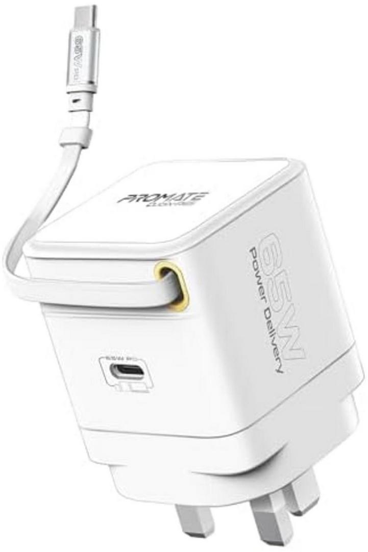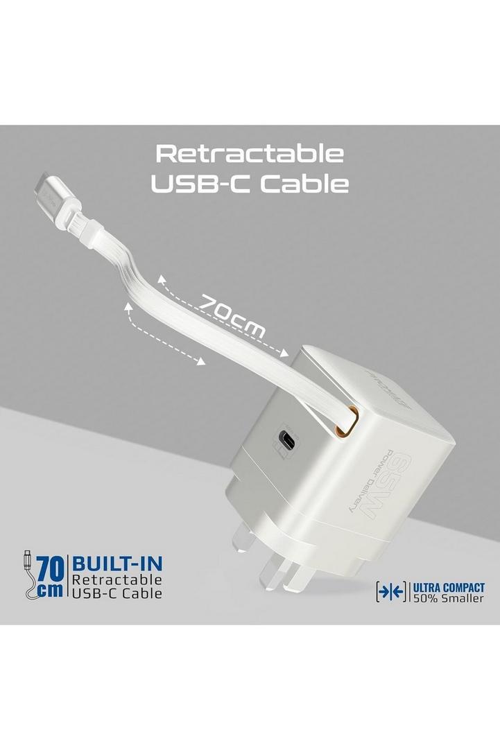 بروميت شاحن GaNFast™ بقوة 65 وات مع منفذ USB-C وكابل قابل للسحب مدمج وحماية من زيادة التيار ونظام حماية متعدد وتصميم مضغوط وشحن سريع لأجهزة الكمبيوتر المحمولة والأجهزة اللوحية والهواتف الذكية، Cubix-R65