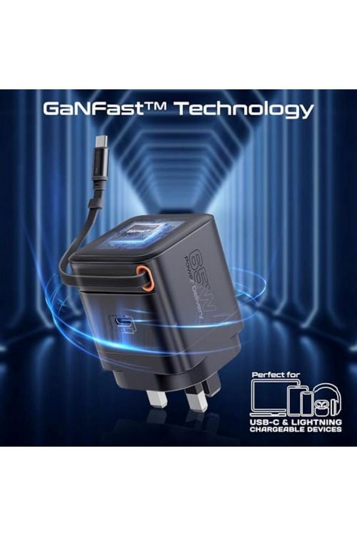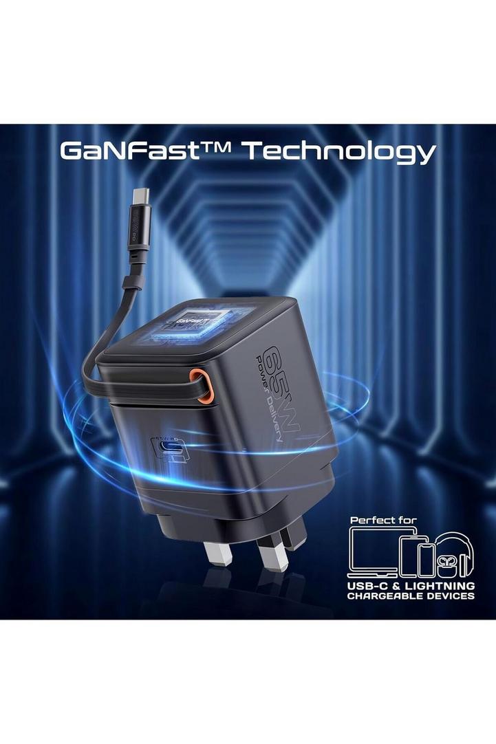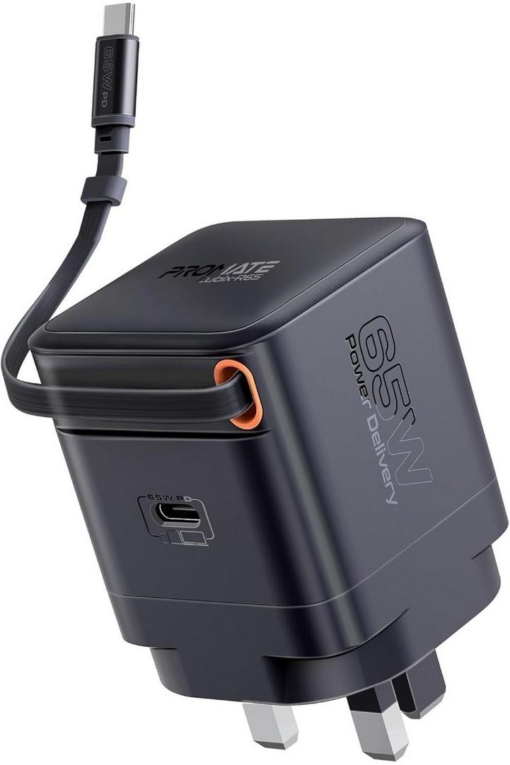 بروميت شاحن GaNFast™ بقوة 65 وات مع منفذ USB-C وكابل قابل للسحب مدمج وحماية من زيادة التيار ونظام حماية متعدد وتصميم مضغوط وشحن سريع لأجهزة الكمبيوتر المحمولة والأجهزة اللوحية والهواتف الذكية، Cubix-R65