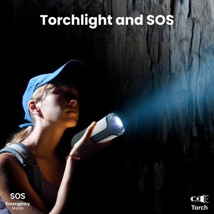 بروميت باور بنك/كشاف تخييم LED، مجموعة 4 في 1 ممتازة للتخييم مع بنك طاقة USB-A™ بقدرة 6000 مللي أمبير في الساعة، مصابيح قابلة للطي بزاوية 90 درجة، 3 أوضاع LED، مكبر صوت 5 وات ومقبض علوي قابل للطي للمشي لمسافات طويلة