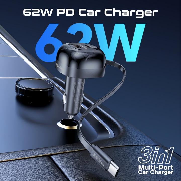 بروميت شاحن سيارة متعدد المنافذ بقوة 62 وات مع كابل USB-C قابل للسحب ومنفذ USB-C، وتقنية الشحن السريع 3.0 من كوالكوم USB-A