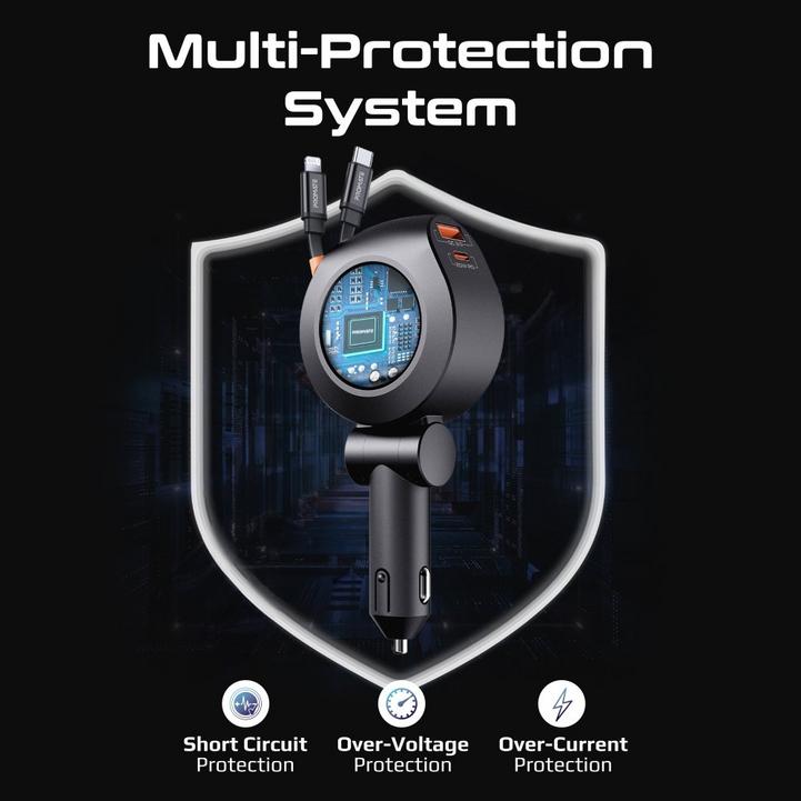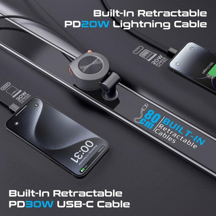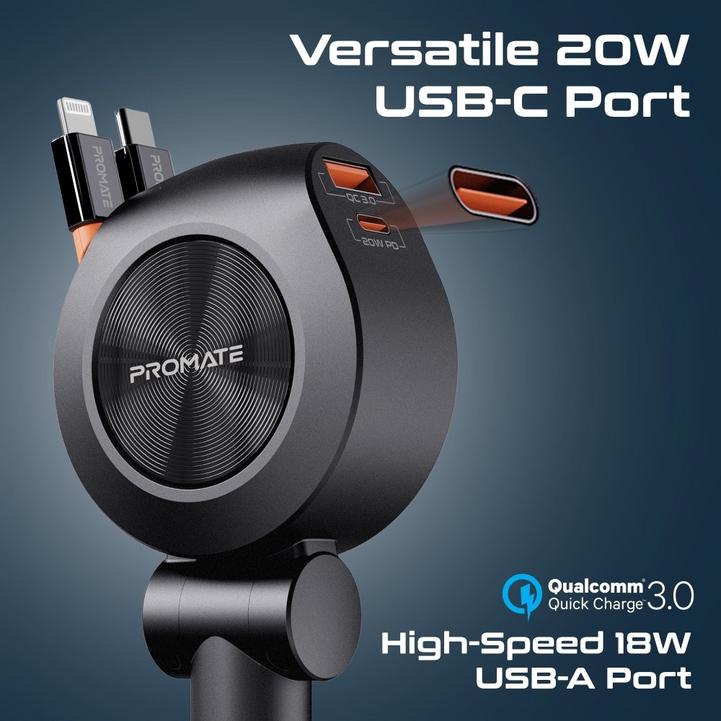 بروميت شاحن سيارة بروميت 4 في 1 متعدد المنافذ بقوة 88 واط مع كابلات USB-C وكابلات لايتنينج مدمجة قابلة للسحب 80 سم ومنفذ USB-C 20 واط ومنفذ USB-A 18 واط ، جسم قابل للتدوير 180 درجة
