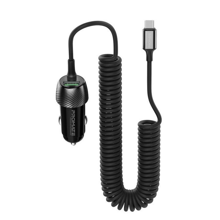 شاحن سيارة بروميت USB-C مع كابل ، شاحن تيار مستمر عالمي بقدرة 33 واط مع سلك ملفوف مدمج من النوع C ، منفذ QC 3.0 USB ومقاومة للحرارة لأجهزة iPad Air و Galaxy S22 و PowerDrive-33PDC