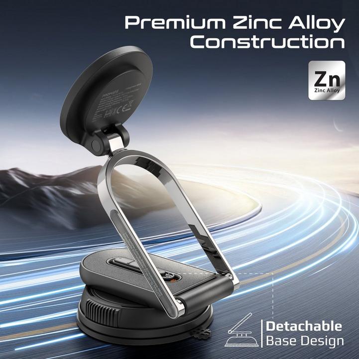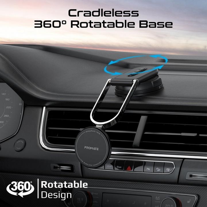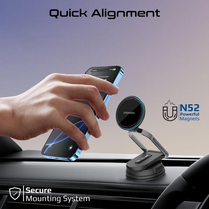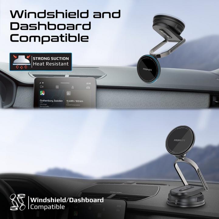 بروميت شاحن سيارة لاسلكي مغناطيسي، حامل جوال للسيارة بقوة 15 واط، متوافق مع الزجاج الأمامي ولوحة القيادة، آلية قفل، ذراع قابل للتعديل والتمدد، قاعدة دوارة 360 درجة بدون حامل