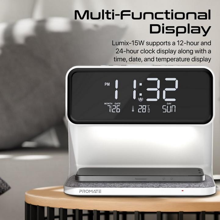 منبه شحن لاسلكي من بروميت ، شاشة رقمية متميزة ، منبه مزدوج مع وظيفة الغفوة ، شاحن لاسلكي Qi فائق السرعة بقوة 15 واط وضوء LED من 3 مستويات لغرفة النوم والمكتب ، Lumix-15W