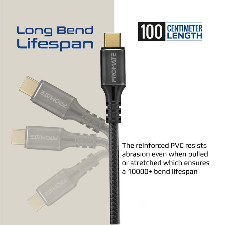 كابل Promate USB-C ، كابل Thunderbolt 3 فائق السرعة بقدرة 240 واط مع دعم شاشة 8K ، سلك مضفر من النايلون 100 سم وسرعة نقل 40 جيجابت في الثانية لجميع الأجهزة التي تدعم Type-C ، PowerBolt240-1M