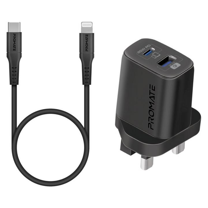 مجموعة محول وكابلات USB-C من بروميت مع شاحن تيار متردد ثنائي المنفذ ، توصيل طاقة بقوة 25 واط ، 18 واط QC 3.0 ، 27 واط من النوع C إلى كابل سيليكون Lightning ، ChargeKit-25PDi