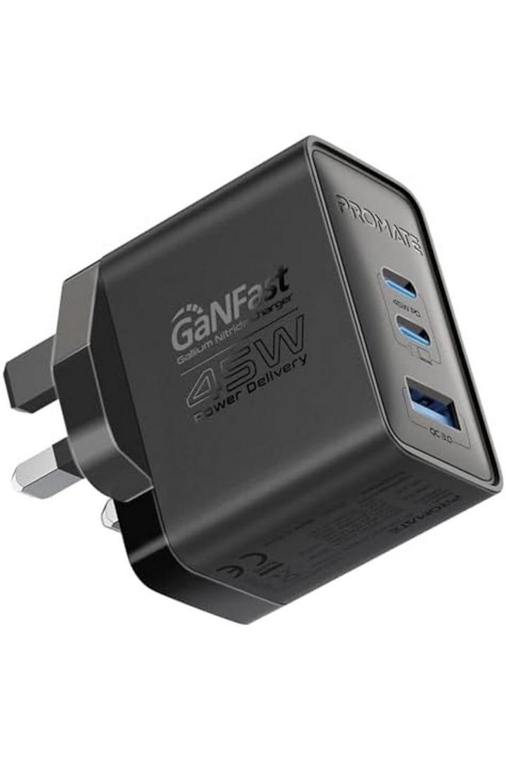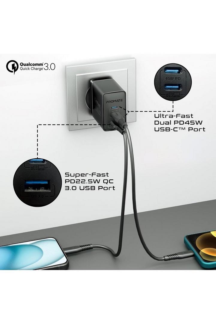 بروميت شاحن جدارى 45 وات جان فاست, منفذي USB-C بقوة 45 واط، ومنفذ USB-A للشحن السريع بقوة 22.5 واط