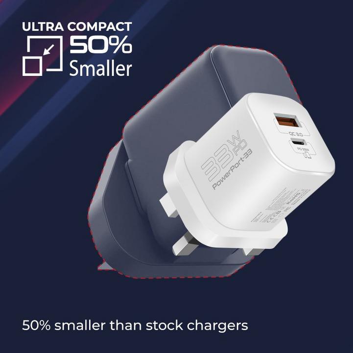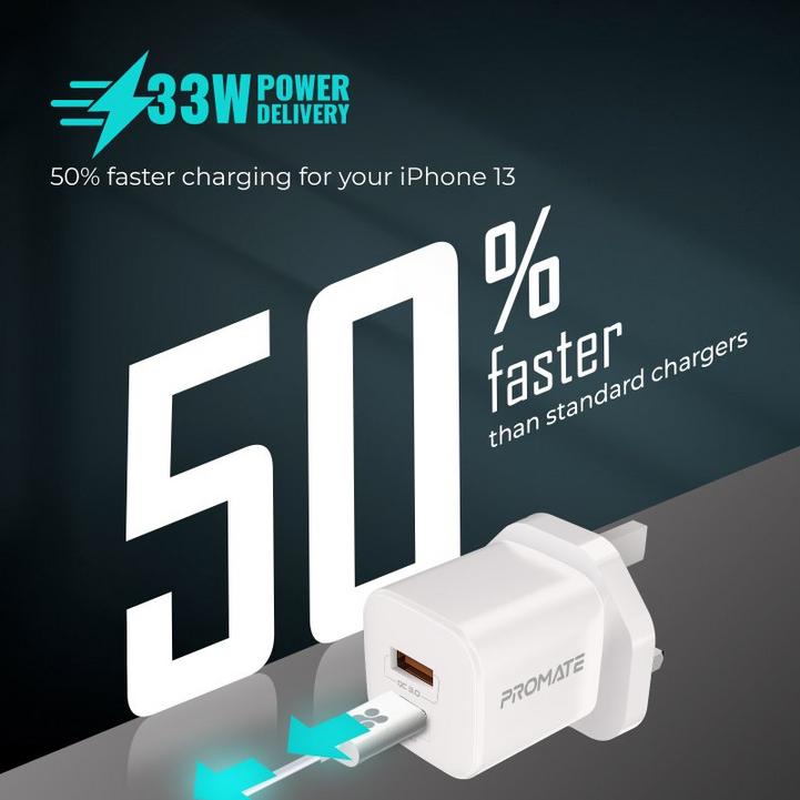 شاحن Promate GaN USB-C ، شاحن حائط USB - C فائق الصغر بقدرة 33 واط مع منفذ شحن سريع بقوة 22.5 واط QC 3.0 ، شحن ذكي متكيف وحماية ماس كهربائى ، PowerPort-33