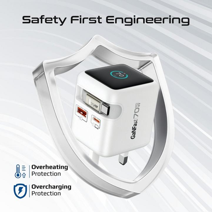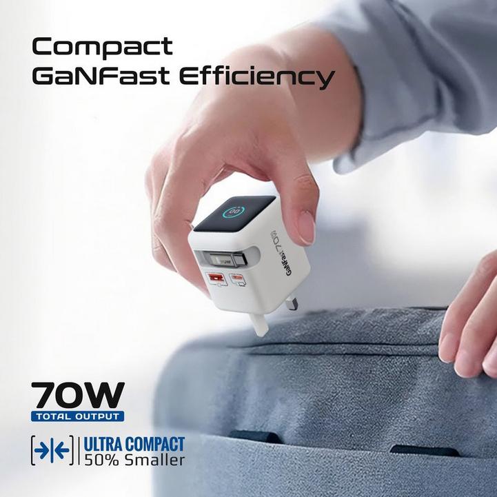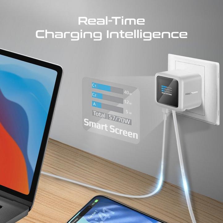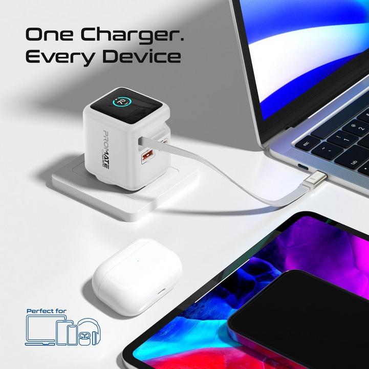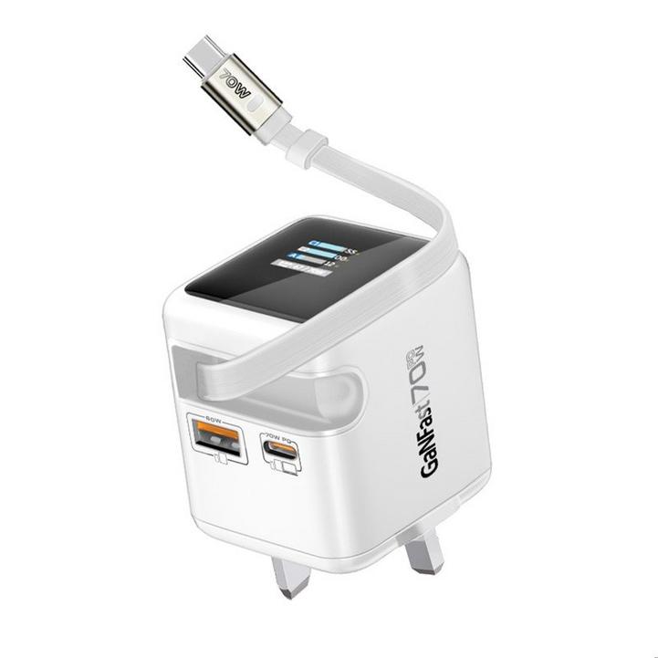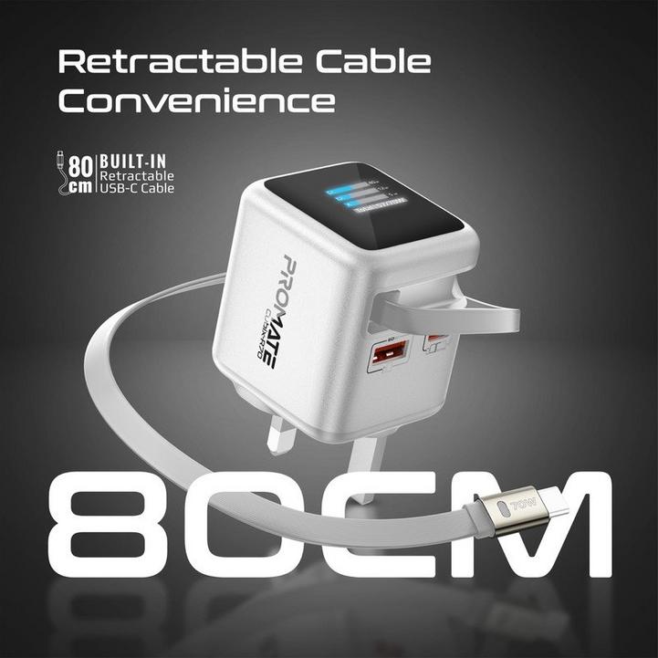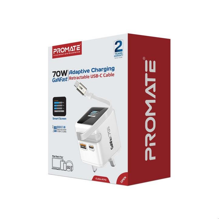 شاحن حائط بروميت GaNFast بقوة 70 واط مع كابل USB-C قابل للسحب بطول 80 سم، ومنفذ USB-C PD بقوة 70 واط، ومنفذ USB-A بقوة 60 واط، وشاشة TFT ذكية مقاس 1.14 بوصة، محول حائط صغير الحجم لأجهزة ماك بوك، وآيفون، وجالاكسي، والمزيد، Cubix-R70