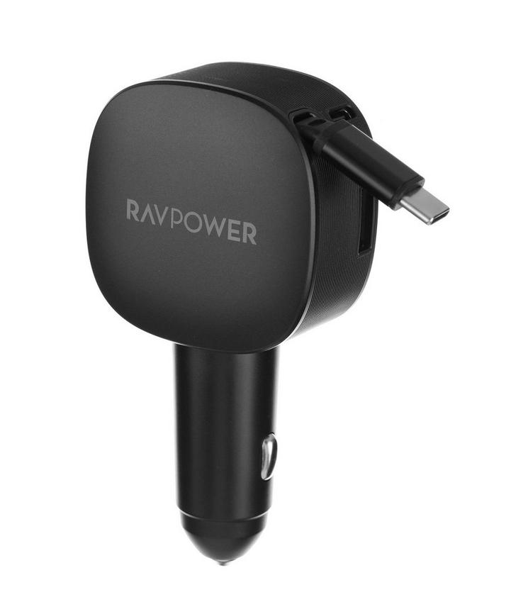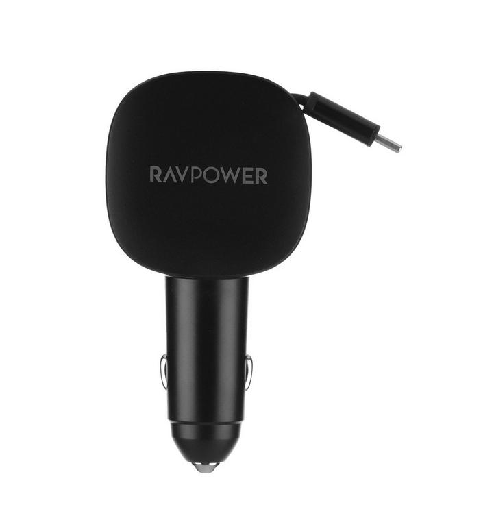 راف باور، شاحن سيارة مع كابل تايب سي قابل للسحب، 75 واط، 60 واط، أسود