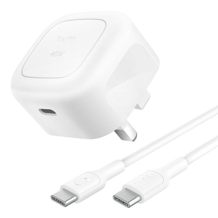 بيلكين، شاحن جداري، 45 واط، منفذ تايب سي مع سلك تايب سي، أبيض