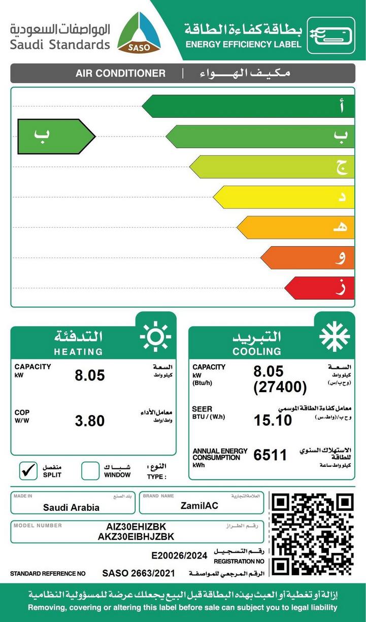 زامل، مكيف سبليت، انفرتر، 27400 وحدة، حار/ بارد