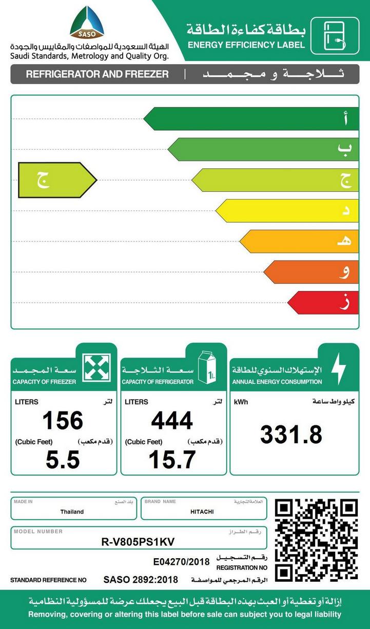 هيتاشي ثلاجه 15.7 قدم, فريزر 5.5 قدم، أنفيرتر، أبيض