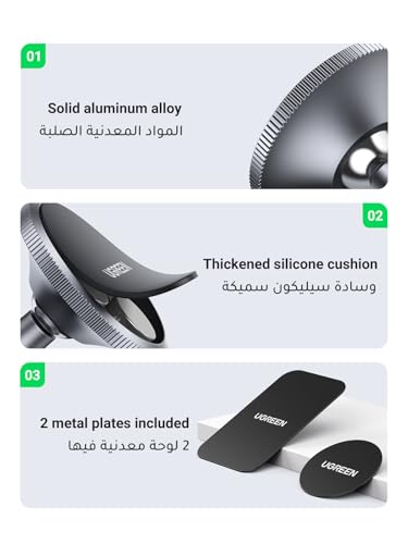 【ملاحظة مهمة】لا يدعم هذا الحامل ماجسيف، لذلك لا يزال يتعين عليك إضافة لوحة معدنية إلى هاتفك. 【قيادة آمنة بدون استخدام اليدين】يؤمن حامل السيارة المغناطيسي هذا هاتفك على لوحة القيادة، مما يتيح إجراء مكالمات بدون استخدام اليدين، والتنقل، والاستماع إلى الموسيقى - مما يبقيك مركزًا على الطريق ومتوافقًا مع قوانين المرور. يتيح تصميمه سريع الفك إمكانية الوصول بسهولة إلى الهاتف مع تعزيز القيادة الآمنة. 【استقرار وأمان موثوق】يستخدم يوجرين حامل الهاتف على لوحة قيادة السيارة 4 مغناطيسات فائقة ولصق قوي 3M للحفاظ على هاتفك آمنًا، حتى على الطرق الوعرة أو التوقفات المفاجئة. يمكن اختيار نوعين مختلفين من اللوح المعدني المغناطيسي بناءً على ظروف الطريق وحجم هاتفك. 【تصميم بسيط ومرونة غير محدودة】حامل هاتف السيارة هذا صغير ولن يسبب أي تداخل مع ملحقات السيارة أو رؤية القيادة. يمكن للكرة المغناطيسية القابلة للدوران بزاوية 360 درجة إمالة الهاتف وتدويره بحرية في أي اتجاه، مما يسمح لك بضبط الهاتف على أفضل زاوية للملاحة. 【جودة متينة وسهلة الاستخدام】يتميز حامل الهاتف المغناطيسي هذا بقاعدة من سبائك الألومنيوم المتينة لدعم قوي، مع وسادة سيليكون ناعمة لمنع الانزلاق والخدوش. يتجنب تصميم المغناطيس الذكي تداخل الإشارة، وبالتالي تظل إشارات GPS والمكالمات الخاصة بك واضحة. 【توافق واسع】 يثبت حامل السيارة المغناطيسي للوحة القيادة الهواتف الذكية التي يقل حجمها عن 7 بوصات بقوة، مثل سلسلة iPhone وسلسلة Galaxy ومعظم الهواتف من العلامات التجارية الأخرى: Xiaomi وOneplus وOPPO وHONOR وPixel وما إلى ذلك. 【ملاحظة هامة】يرجى قراءة مخطط عملية التثبيت بعناية في وصف المنتج قبل تثبيت المنتج: تنظيف لوحة القيادة؛ ألصق اللوحة المعدنية؛ اضغط بقوة لمدة 15 ثانية؛ انتظر لمدة 12 ساعة قبل الاستخدام. 【ما تحصل عليه】1 حامل هاتف مغناطيسي للسيارة، 2 لوحة مغناطيسية، 1 دليل مستخدم، ضمان لمدة 24 شهرًا، خدمة عملاء على مدار 24 ساعة، دعم فني مدى الحياة.