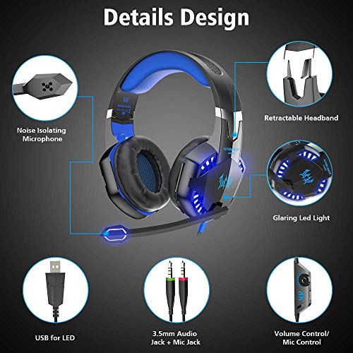 سماعات راس ستيريو جديدة للالعاب كوشن جي 2000 من ايتش، مع ميكروفون وجاك 3.5 ملم واضاءة LED وصوت جهوري وخاصية الغاء الضوضاء لجهاز بلاي ستيشن 4/اكس بوكس ون اكس/لابتوب/تابلت، سلكي، أزرق، فوق الأذن