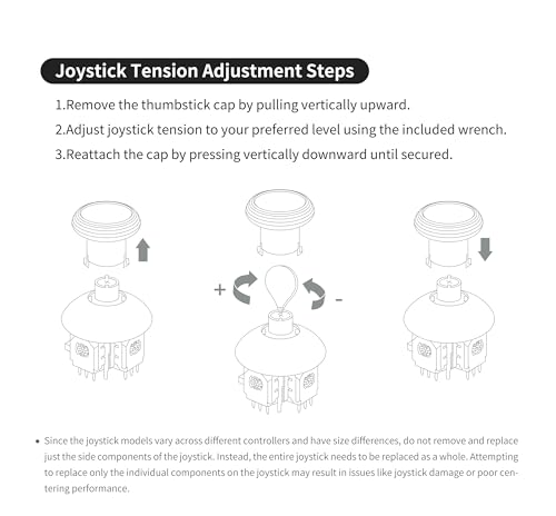 تقنية عصا التحكم المقاومة للانجراف المطورة المضادة للانجراف - تم تطويرها من عصا التحكم هول ايفيكت الحاصلة على براءة اختراع من جوليكيت، تعمل عصا الإبهام الأكثر تقدمًا (المقاومة المغناطيسية للنفق) مع آلية استشعار المجال المغناطيسي بدون تلامس للقضاء على سبب انجراف العصا، بينما توفر استهلاكًا منخفضًا للغاية للطاقة وثبات معزز ومتانة طويلة الأمد خالية من الانجراف ودقة عالية ونعومة تشبه الحرير. شد قابل للتعديل بدون مستوى 720 درجة مع أداة: تتميز عصي التحكم الخاصة بنا بضبط شد أقل مستوى 720 درجة (دورتين كاملتين)، مما يسمح لك بتخصيص قوة التحكم بسهولة. لضبط الشد المفضل لديك، ما عليك سوى إزالة الغطاء (اسحب رأسياً) واستخدم مفتاح الربط المتضمن لضبط الشد عن طريق تدوير المسمار الذي يحمل علامة + و-. يمكن لآلية الشد المخفية أسفل الغطاء أن تمنع التعديلات العرضية. مجموعة إصلاح وترقية عصا التحكم لجهاز بلاي ستيشن 5: وحدة عصا التحكم هي بديل مباشر لوحدات التحكم دوال سينس دوال سينس ودوال سينس ايدج، لمعالجة مشاكل الانجراف والدقة. يتم تركيبه بسهولة دون الحاجة إلى أي تعديلات على الدائرة، مما يضمن تجربة ترقية سلسة. لاحظ أنه يجب استبدال عصا التحكم بالكامل كوحدة (عصا تحكم وغطاء). قد يؤدي الاستبدال الجزئي إلى مشكلات مثل تلف عصا التحكم أو ضعف أداء التركيز. تتضمن 3 أزواج من أغطية جويستيك: توفر مجموعة عصي التحكم الخاصة بنا 3 أنواع من الأغطية بارتفاعات وشعور مختلف للمستخدم. لكل من الفك والتجميع، تحتاج إلى السحب أو الضغط لأسفل عموديًا على طول الأخدود. يمكن إزالة الحلقة المعدنية الموجودة على غطاء عصا التحكم للحصول على نطاق أوسع من الحركة، مما يوفر مرونة أكبر ولكن قد يزيد أيضًا من التآكل والتمزق على العصا. المعايرة المطلوبة: لأجهزة التحكم دوال سينس وبلاي ستيشن 5 دوال سينس ايدج، بعد استبدال عصي التحكم، استخدم الأداة الموجودة على موقعنا لمعايرة عصي التحكم وفقًا للتعليمات. ملاحظة: يتطلب عمل استبدال عصا التحكم التناظرية مجموعة أدوات احترافية / أجهزة إصلاح (غير متضمنة في عبوتنا) ومهارات جيدة في إزالة اللحام واللحام. إذا لم تكن خبيرًا في اللحام، نوصي بالبحث عن مساعدة احترافية لضمان التركيب المناسب.