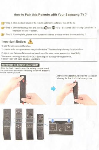 توافق عالمي: جهاز التحكم عن بعد البديل لتلفزيون سامسونج الذكي، متوافق مع تلفزيونات سامسونج 4K Ultra HD SUHD كريستال HDR OLED LED LCD QLED UHD منحنية وأكثر من ذلك. طرازات التحكم عن بعد المتوافقة: يتوافق مع أجهزة التحكم العالمية الذكية من سامسونج BN59-01312A، BN59-01312G، BN59-01301A، BN59-01259B، BN59-01330A، BN59-01260A، BN59-01267A، BN59-01292A، BN59-01292A، BN59-01 298H، BN59-01241A، BN59-01178W، BN59-01289A، BN59-01266A، BN59-01220E، BN59-01199F وغيرها. موديلات التلفزيون المتوافقة: بديل لأجهزة التلفزيون الذكية سامسونج 6 سيريز 7 سيريز 8 سيريز QLED Q60T Q70T Q80T. مثل: RU7100 - RU8000 - RU9000 - TU8000 - TU8200 - TU8300 - Q60T- Q70T- Q80T - Q90T - Q800T - Q900TS - Q950TS - LST7 - LS05- Q50 - Q60 - Q70 - Q80 - Q90 - Q900 - MU6300 - MU7000 - NU8000 - NU8500 - Q6F - Q7F - Q7C - Q8F - Q9F سلسلة وأكثر من ذلك.