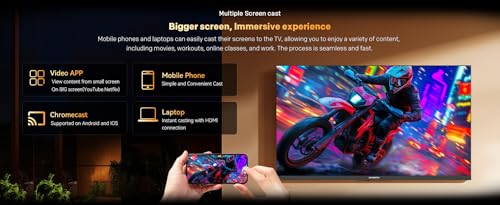 شاشة كيو ليد مقاس 43 بوصة بدقة 2 كيه: استمتع بألوان نابضة بالحياة وتفاصيل حادة وتباين محسن لتجربة مشاهدة غامرة. نظام جوجل الذكي التلفزيوني: يمكنك الوصول إلى آلاف التطبيقات والأفلام والعروض من نتفليكس ويوتيوب وبرايم فيديو وديزني وغيرها (قد يختلف التوفر حسب المنطقة). معدل تحديث 60 هرتز. توفر حركة سلسة لمشاهدة الرياضة والأفلام والترفيه اليومي. واي فاي وبلوتوث مدمجان: يمكن توصيلها بسهولة بالإنترنت ومكبرات الصوت وسماعات الرأس والأجهزة اللاسلكية الأخرى. خيارات اتصال متعددة: تتيح منافذ اتش دي ام اي ويو اس بي سهولة الاتصال بوحدات التحكم في الألعاب ومشغلات الوسائط وأجهزة التخزين الخارجية الأخري. تصميم نحيف وعصري: إطار أنيق وبسيط يكمل مظهر أي غرفة معيشة أو غرفة نوم أو مكتب.