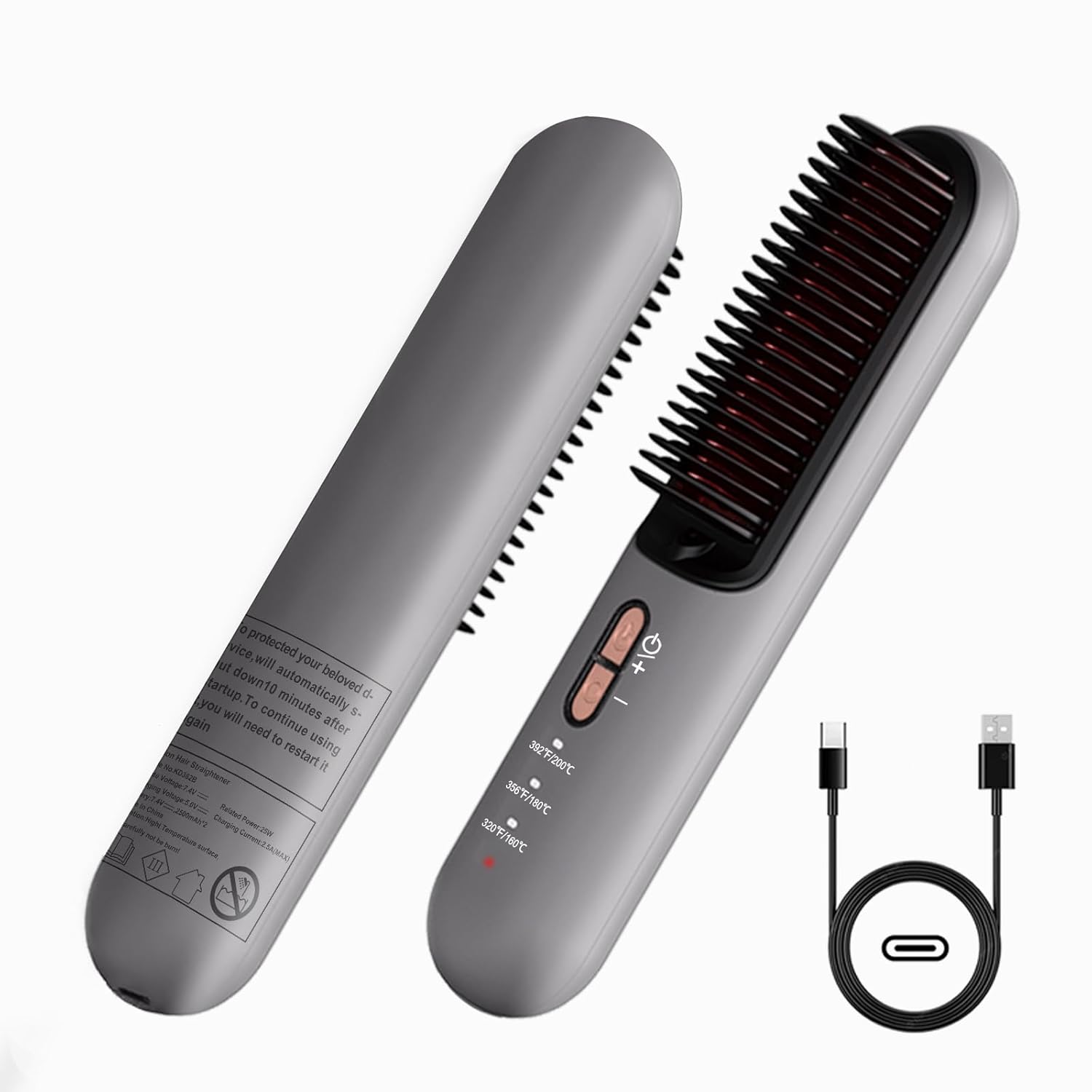 فرشاة فرد الشعر اللاسلكية المحمولة المطورة للنساء بحجم مناسب للسفر مشط 2 في 1 بالأيونات السالبة قابل لاعادة الشحن من النوع C، رمادي، سيراميك