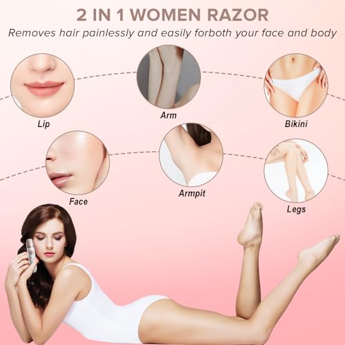 ✅【2 in 1 Electric Shaver】Electric razors for women include 1 facial shaver head and 1 body shaved head, which can helps customize hair shaving on your face, arms, legs, body, armpits and bikini lines etc in minutes. Multi-functionally shaving unwanted hair effectively. 💦【Safty Dry & Wet Shaver】The detachable razor head design and long cleaning brush make this hair trimmer easy to clean.electric razor safe to use even in bath or shower. ✅【Painless】You won't have stinging feelings when using this electric razor for women, The high-quality electric hair remover has hypoallergenic stainless-steel blades, helping to achieve close and safe shaving with no pain or irritation, even for sensitive skin. Skin friendly and painless hair shaving. 💦【USB Rechargeable】Fast 2 hours charging allows 60 minutes shaving time, is portable and convenient for travel, charging by PC, direct power connection, etc.The hair remover has a super long lifespan, no need to charge frequently. ✅【Portable Design for Travel Use】This electric razor for women with ergonomic design is easy to hold and fits well in your hand.Fashionable design, beautiful box, small size, also a perfect gift for friends or family.