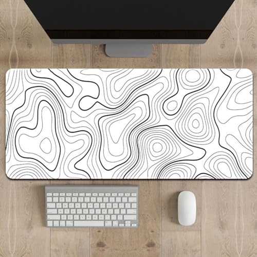 قاعدة ماوس للألعاب من اي سي في في، بحجم XL - قاعدة ماوس كبيرة 80 × 30 سم مع جزء خلفي من المطاط مقاوم للانزلاق للوحة المفاتيح والماوس، للمنزل والمكتب (لون أبيض مع خطوط خرائط طبوغرافية أسود)، البوليستر