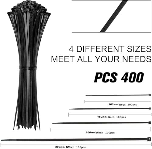 اربطة كيبلات بسحاب، 400 قطعة بمقاسات متنوعة 12+8+6+4 انش، متعددة الاغراض ذاتية القفل من النايلون، اربطة اسلاك بلاستيكية للمنزل والمكتب والحديقة وورشة العمل (ابيض)