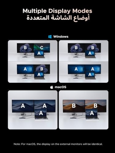 【قاعدة شحن USB C 10 في 1】تأتي قاعدة شحن يوجرين مع منفذ HDMI 2x4K@60Hz و2x10Gbps USB-C ومنفذان بيانات USB-A بسرعة 10 جيجابت في الثانية، ومنفذ USB-C PD 100 واط، ومنفذ ايثرنت 1x1000 ميجابت لكل ثانية وفتحات بطاقة SD/TF 104 ميجابايت/ثانية 【شاشة HDMI مزدوجة بدقة 4 كيه عند 60 هرتز】استمتع بتعدد المهام بسلاسة وسير عمل إبداعي مع شاشة مزدوجة بدقة 4 كيه توفر حيوية ونقية بتردد 60 هرتز ثابت. يرجى ملاحظة أنه نظرًا لقيود نظام التشغيل MacOS، ستعرض جميع الشاشات الممتدة نفس المحتوى عند توصيل أجهزة ماك بوك 【منافذ بيانات USB متعددة بسرعة 10 جيجابايت في الثانية】توفر الشاشة المزدوجة موزع USB نوع سي 4 منافذ سريعة بسرعة 10 جيجابايت في الثانية لنقل البيانات بسرعة فائقة، يوفر الجمع بين منافذ USB-C وUSB نوع ايه اتصالاً متعدد الاستخدامات 【توصيل طاقة 100 واط】قل وداعًا للقلق بشأن البطارية! تدعم قاعدة شحن اللاب توب ما يصل إلى 85 واط من خلال منفذ يو اس بي نوع سي بي دي، وتحتفظ بقدرة 15 واط لتشغيل الواجهة الأخرى. ملاحظة: يدعم المنفذ الشحن فقط؛ ولا يسهل نقل البيانات أو إخراج الفيديو 【ايثرنت بسرعة 1000 ميجابت لكل ثانية وبطاقة اس دي/ تي اف 104 ميجابايت/ثانية】تم تجهيز موزع USB C بمنفذ ايثرنت بسرعة 1000 ميجابت لكل ثانية، مما يوفر للمستخدمين ميزة اتصال إنترنت عالي السرعة بشكل استثنائي. مزود بقارئ بطاقات اس دي/تي اف لتلبية احتياجات قراءة بطاقتك 【آمن وآمن】يوفر التصميم الحصري من خليط الألومنيوم من يوجرين وميزات الأمان المكونة من 4 طبقات أمانًا شاملاً. كما أن قاعدة USB C متوافقة مع أجهزة اللاب توب المزودة بمنفذ USB-C تقريبًا مثل ماك بوك برو/اير وديل لاتيتيود وثينك باد وزين بوك وكروم بوك وسيرفيس 【ما تحصل عليه】1 × قاعدة شحن يوجرين 7 في 1 USB C، 1 × دليل المستخدم، ضمان لمدة 24 شهرًا، خدمة عملاء على مدار 24 ساعة، دعم فني مدى الحياة