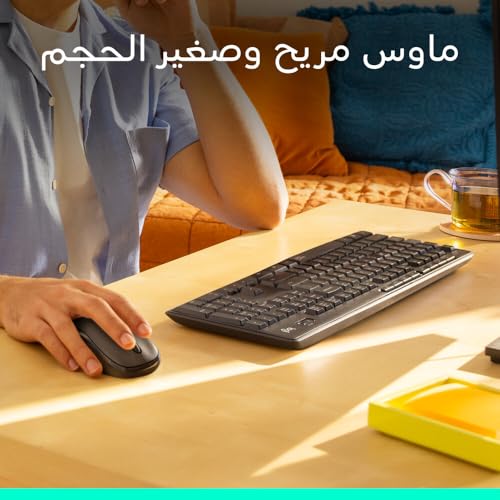 مجموعة ماوس وكيبورد لاسلكي صامت MK295 بتقنية سايلنت تاتش من لوجيتيك، لوحة ارقام كاملة، تتبع بصري متقدم، لاسلكي بدون تاخير، ضوضاء اقل 90%، كيبورد عربي، جرافيت