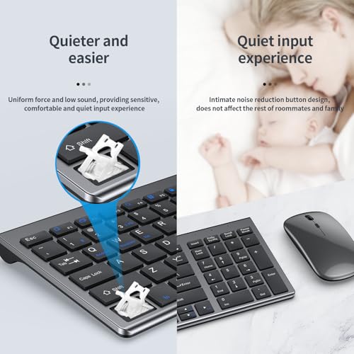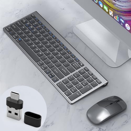 💻【Type-C Rechargeable Battery】The 500mAh & 350mAh rechargeable lithium battery will last for 200H. Auto-sleep mode and on/off design also keep a low consumption.Do not use fast charging for charging. Otherwise, it may cause damage to the product. 💻【Whispered-Quiet Typing and Clicking】With increased key stability to reduce noise and optimize responsiveness, the wireless keyboard and mouse give you that satisfying “click” feel, but not to hear it, perfect for those who are productivity-focused 💻【Ultra-Slim Appearance】This is a low profile wireless keyboard mouse set.Design with only 0.6 cm for keyboard and 2.7 cm for mouse, which is easy to slip into your bag. 💻【Wide Compatibility】This keyboard and mouse combo is fully compatible with Windows,IOS,Android.Compatible with Mac,Pad,Laptop,PC,Phone.Wireless mouse that offers 3 DPI settings (800/1200/1600) for quicker and more responsive clicks. 💻【Convenient Quick Switch】 2-IN-1 USB-A/C port.Connect your keyboard and mouse wireless combo to your computer or laptop effortlessly.Switch by FN +1/2/3 Different equipment, multiple jobs without delay.
