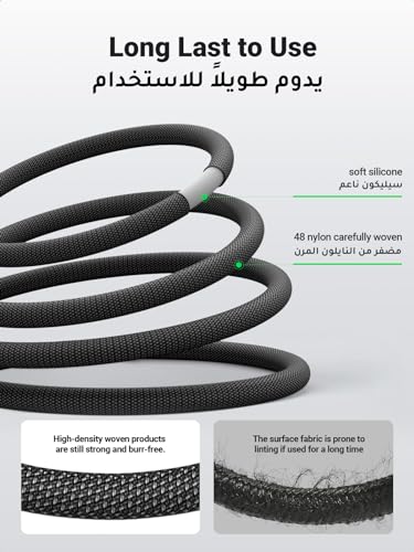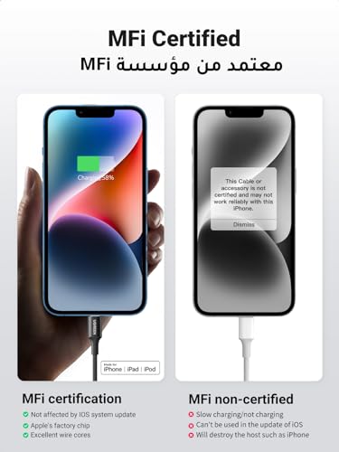 【New Chipset & MFi-certified】: This iPhone charger cable uses Apple's original C94 terminal and smart chip to recognize and connect your Apple devices immediately Mfi Certified cables provide a safe and stable charging solution for your devices Enjoy lightning-fast data transfer, Sync, and charging. 【Goodbye to Easy Broken Connector】:High-density woven iPhone cable, still wear-free after long-term use, swing 20,000 times without breaking, at the same time, it is highly flexible and easy to store, making it a very good companion when traveling. 【Added Protection】The wire core is added with precious FEP material as the outer quilt, which makes the wire resistant to high temperature and wear and prolongs the service life. 【Safer and more secure iPhone】Lightning Cable adopts the same C94 connector officially certified by Apple, and is certified by Apple's official MFi system. It is compatible with the entire iOS system, stable without pop-up windows, safe charging, and will not damage the charging head and mobile phone battery. 【Widely Compatible】: The iPhone charger cable fully compatible with iOS and works flawlessly with any Apple devices which has a lightning connector. The lightning cable supports PD Fast Charge 3A (max) compatible for iPhone 14/14 Pro/14 Plus /14 Pro Max, iPhone 13 Pro/13 Pro Max/13/13 mini, New ipad 9, iPad Pro 10.5" / 12.9" and iPhone 12 mini/12/12 Pro, 11 /11Pro /11Pro Max/XS Max; standard charge (5V/2.4A max) for iPhone 7 / 7 Plus, (5V/1A max) for iPad 9.7", iPad Pro 9.7", iPad Air 9.7", etc. 【What You Get】: UGREEN 1* Nylon Braided USB C to Lightning Cable 1M (Black) , 1*user manual, 24-month warranty, 24-hour customer service, lifetime technical support.