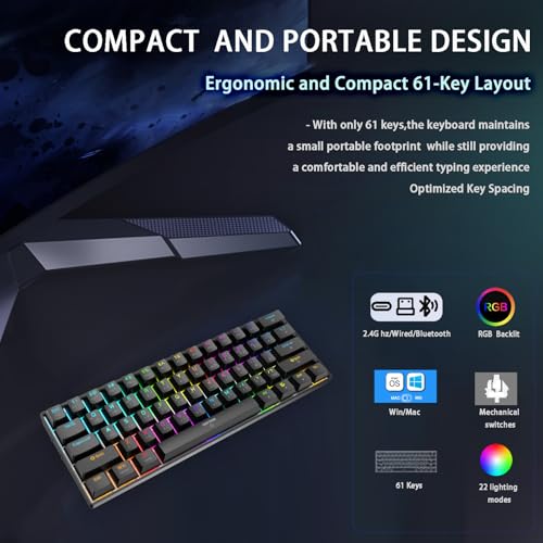 Tri-Mode Connectivity: Supports 2.4G wireless, Bluetooth, and USB Type-C wired connections for versatile use. Multi-Platform Support: Compatible with Windows, Mac, Linux, and tablets for seamless integration across different devices. Advanced Functionality and Customization: Supports FN key combinations for hardware function switching, full key rollover, 22 backlight modes, and adjustable backlight brightness and frequency. High-Performance Mechanical Switches: Equipped with brown mechanical switches for a balanced tactile and responsive gaming experience. Compact and Durable Design: 61-key layout with double-shot injection keycaps made from durable ABS material, offering a sleek and ergonomic design. Ultra-Fast Response Time and Long-Lasting Battery: Response time of ≤5 milliseconds, key lifespan of ≥50 million presses. Continuous working time of 22 hours with backlight, 312 hours without backlight, and standby time of over 10 months.