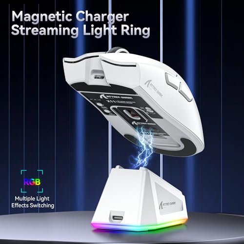 ماوس ألعاب X11 مع قاعدة شحن مغناطيس ومستشعر ألعاب بيكسارت PAW3311، بلوتوث 2.4 جيجا ولاسلكي وسلكي، بدقة 22000 نقطة لكل بوصة، للمكتب والألعاب من اتاك شارك، أبيض