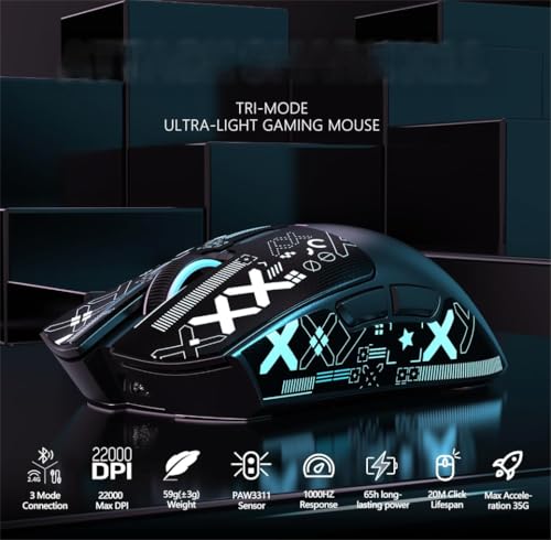 【59 g Ultra-Lightweight Design&Anti-slip mouse Grip Tape】X11 white gaming Mouse features an ultra-lightweight construction,weighing just 59±3g,this is a comfortable weight for gamers,allowing you to move the mouse faster during game operations.Extremely thin, non-slip grip tape with a technological appearance,cut to fit, reduce hand sweat while adding friction to the wireless mouse, improving the player's control of the mouse during the game. 【Magnetic RGB Charging Dock with USB 2.0 port】X11 white wireless mouse complete with a magnetic RGB fast charging dock, that provides 5 hours of use on a 10-minute charge. X11 wireless mouse Bluetooth/2.4G/wired three connection mode switching only need a computer port,easy to operate, no need to plug and unplug frequently. 【PixArt PAW3311 Gaming Sensor】The X11 gaming mouse is powered by exceptional performance optical mouse PixArt 3311 flagship sensor, 6 levels of adjustable DPI up to 22000,1000hz/1ms polling rate ,300 IPS speed, 35g acceleration,provides unmatched accuracy and response speed for competitive games. 【TTC Encoder& 20 Million Clicks】X11 Pc mouse wheel adopts TTC encoder, more precise stepping.This ultra-long life wireless mouse is also equipped with HUANO micro switch,it's crisper to use, no double click,mouse clicks over 20 million cycles ,can be used for decades. 【Tri-mode Connectivity】Unlike wired mice, in order to meet the needs of different scenarios like study or office ,the X11 wireless mouse offers three different connection modes:wired USB-C, 2.4GHz and Bluetooth mode, which can be easily switched through the button on the back of the mouse. 【Ergonomics & Medium to Large Hand Size】X11 Ergonomic mouse left and right buttons are slightly concave to fit the shape of your fingers, and the size of 128*64*40.5mm is more suitable for medium to large hand men. Allow gamers to get a firmer grip in the competition . 【Programmable Mouse】 X11 gaming mouse with side buttons and self-developed driver software.Configure your rechargeable mouse in driver software to program 5 programmable buttons, DPI settings, polling rate, and more.