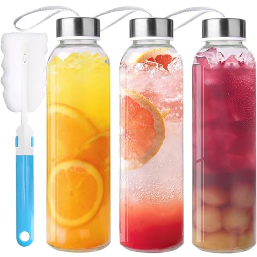 Durability & Reusable & Healthy Quality: 18 oz/500ml juicing bottles are made from premium quality food-safe durable thick glass with chemical and impact resistance, which is BPA and Lead free. The juicing bottles reusable glass are designed to be tough and with stand a long time of use. Airtight And Leak Proof: Each juice bottle comes with a stainless steel cap and Carrying Strap which is lined with a rubber O-ring. The 100% leak proof glass bottle will never leave a leaky mess no matter how you place it. The clear glass helps you quickly spot the drink you're in the mood for. Glass Bottles For Juicing And More: Durable stainless steel lid with air and water-tight seals, it’s completely airtight to keep your beverage fresh without any worry of spills. Throw this glass water bottle in your bag or car and get a healthy start to your day with a juice, smoothie, brew, ice tea, iced coffee, milkshakes. Stay Hydrated Wherever You Go: The slim and portable design means you can take your glass juice bottles with cap everywhere, perfectly for garden parties, homemade drinks, weddings, picnics, school, work, gym, fitness, yoga and beach trips. Easily store in the fridge, lunch bag or car cup holder. Dishwasher Safe Water Bottles - These glass water bottles are dishwasher safe, but please remove the caps first. Comes with a cleaning brush for easy hand washing with warm water. Glass bottles are stain and odor resistant, keeping your beverage or water fresh and safe.