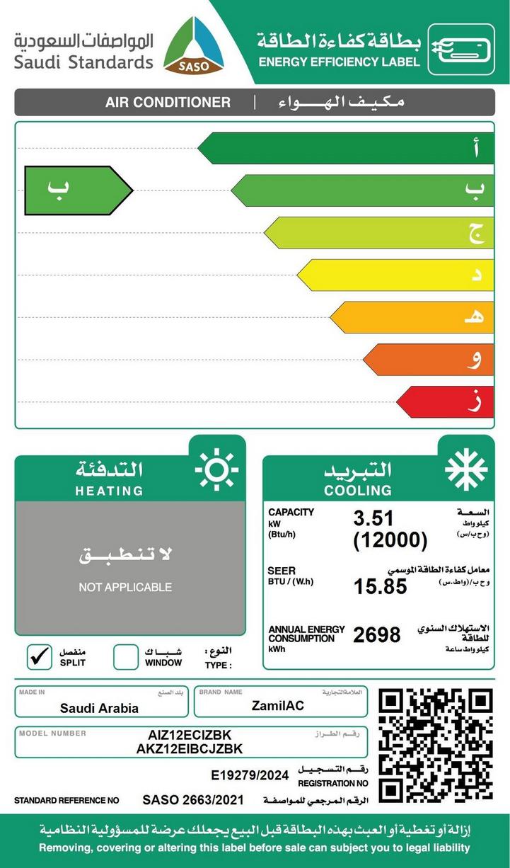 Zamil Inverter Split AC 12,000 BTU Cool Only, Anti-Corrosive Design, Auto Swing