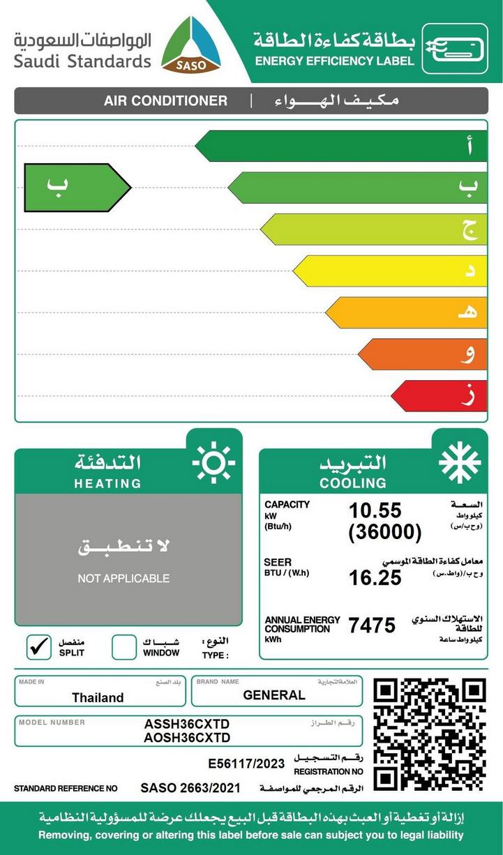 General Split AC, 36,000 BTU, Cold Only, Inverter Compressor, R32 Eco, Blue Fin