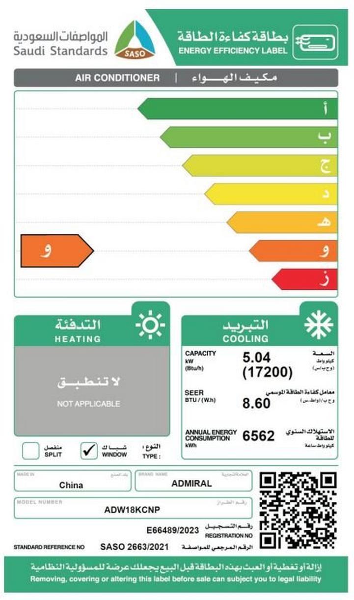 Admiral Window AC 17,200 BTU, Cool only, Gold Fin, Rotary Compressor