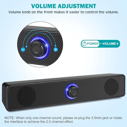 【Stereo Sound & Noiseless】Our computer speakers adopt the 6W large full-range drivers technology. Delivers immersive stereo sound for breathtaking audio when you enjoy the movies, videos, music and games. 【Wide Compatibility】This desktop speakers supports most of the devices with standard 3.5mm jack, such as computers, desktops, laptops, tablets, PCs, Pad, CD players, MP3. Matches with most computer's operating systems, such as Windows, Unix, Linux and NetWare etc. 【Plug and Play】Our laptop speakers connect with the usb port (5V/0.5A) and 3.5mm audio port of PC simultaneously, without driver or software. Powered by 49.6inch usb cable, avoid the trouble of recharging. NOTE: When only one channel sound, please re-plug the 3.5mm jack or rotate the interface to achieve the 2.0 channel effect. 【Stylish Slim Design】Features a low-profile unibody speaker design, perfectly placed under your computer screen. Volume knob on the front makes it easier to control the volume.