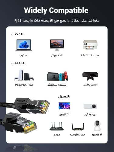 【Gigabit Ethernet Cable】UGREEN Cat 6 Ethernet cable supports up to 1000Mbps data transfer (10x compared to Cat5e with 100Mbps) and 250MHz bandwidth (2.5x compared to Cat5e with 100MHz) with less interference, a great choice for playing games, online video streaming, downloading files, etc. No more dropouts, greatly improve your work efficiency. 【Universal Compatibility】This high-speed Cat6 Ethernet cable not only backward compatible with Cat5, Cat5e cables but also works well with all RJ45 connector devices such as iMac Pro, PS5, PS4, PS4 Pro, PS3, Raspberry Pi 4, WiFi extender, Switch, Smart TV, Xbox, Xbox One, Sky Q box, video game consoles, TV decoder, BT Smart Hub, Virgin modem, Patch Panel, WiFi router, PCs, Network printers, media players, TV box, VoIP phones, Freebox, Livebox, Blu-ray Player, etc. 【Braided Ethernet Cable】UGREEN Cat 6 network cable is more endurable for lasting longer than others. It's made of high-density braided material which endures over 10,000 bending tests: flexible, stronger and wear-resistant. Besides, there are anti-oxidatant connectors with anti-dust caps will help to keep the connectors tidy and durable. 【Robust & Reliable】UGREEN Internet Cable is made from 28AWG pure copper wire, lower impedance and less loss with high-performance. 8Pcs gold-plated contacts fit snugly with the ethernet cable, to provide a faster and more stable internet connection. The diameter of this braided Cat6 Ethernet cable is 5.5mm, robust and durable enough running around the corners or door frame, etc. 【High Performance】This gigabit ethernet cable was build-in 4 pairs of twisted-pair, enhance anti-interference ability and provide the high performance. With 6mm reinforced connector, no worry about interface fracture even used in narrow space. Ideal Cat6 Ethernet cable ensures a stable connection for Home office, School, Hotel, Internet cafe, Computer data center, Cloud server, Enterprise server, etc. 【What You Get】:( 1* 5meter Cat6 Braided Ethernet Cable), 1*user manual, 24-month warrantyt, 24-hour customer service, lifetime technical support.