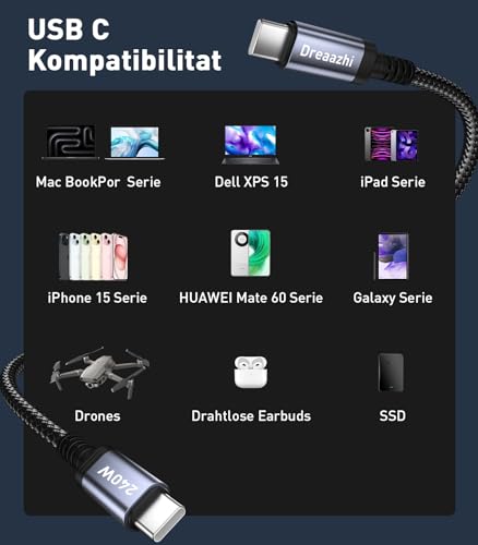 【5M Extra Long, Convenient】: Dreaazhi 5M Ultra Long USB C anf USB C charging cable is suitable for a variety of occasions, can be used at home, outdoors, in the office, in the car and other places. Designed for long distance charging. 【240W PD Fast Charging】This 5 metre USB C to USB C fast charging cable is compatible with 240W/100W/60W/45W/36W/27W/15W safe charging speeds and data transfer speeds up to 480Mbps. 【Smart ChipThe】 built-in E-Marker chip automatically identifies the maximum power supported by the device. This can better protect the device battery. 【Durable and safe design】: High-quality braided nylon jacket makes the USB-C cable stronger, tangle-proof and sturdy. More flexible and durable, it can be bent 20,000 times, and the strong metal plug ensures that the plug part is not easy to loosen, ensuring the flexibility and durability of the charging cable. 【ABOUT CUSTOMER SERVICE】Dreaazhi offers 18 months worry-free USB C cable 5M fast charging cable warranty and 24/7 customer service. We pursue thoughtful design and reliable quality, and we are confident in our products and our customers.