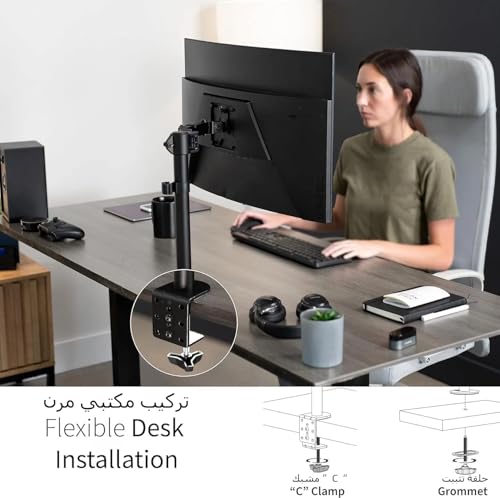 Screen Compatibility - This single-arm mount fits screens that weigh up to 22 lbs with backside mounting (VESA 75x75mm or 100x100mm). This covers most monitors on the market between 13” and 32”, as well as ultrawide monitors up to 38”. Articulation & Height Adjustment - Adjustable arm offers +90° to -90° tilt, 360° swivel, 360° rotation, and height adjustment along the center pole. Monitor can be placed in portrait or landscape orientation. Integrated Cable Management - Keep your power and AV cables clean and organized with detachable cable clips on the arms and center pole. Easy Installation - Mounting your monitor is a simple process with the detachable VESA plate, and we provide all the necessary hardware and instructions for easy assembly. The stand secures to your desk with a heavy-duty C-clamp or optional grommet. We've Got You Covered - Sturdy steel design is backed with a 3 Year Manufacturer Warranty and friendly tech support to help with any questions or concerns.